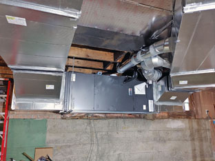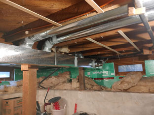 This retrofit project consisted of removing an old inefficient oil furnace and replacing it with a new air handler/heat pump. The new ductwork is far more efficient while being far more compact. Included inside the ductwork are turning vanes, and acoustic insulation to guide the air and effectively reduce turbulent air noise.