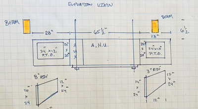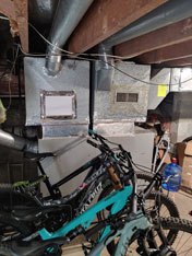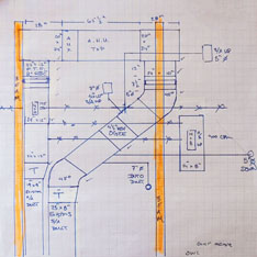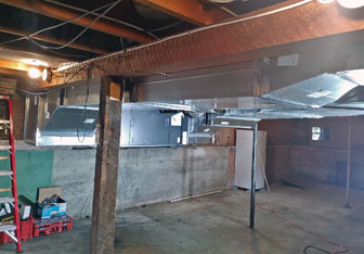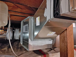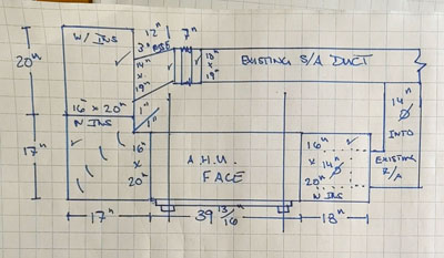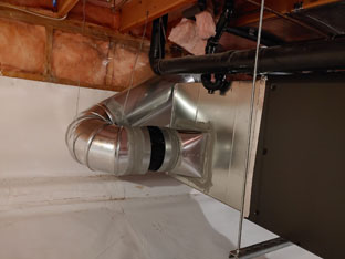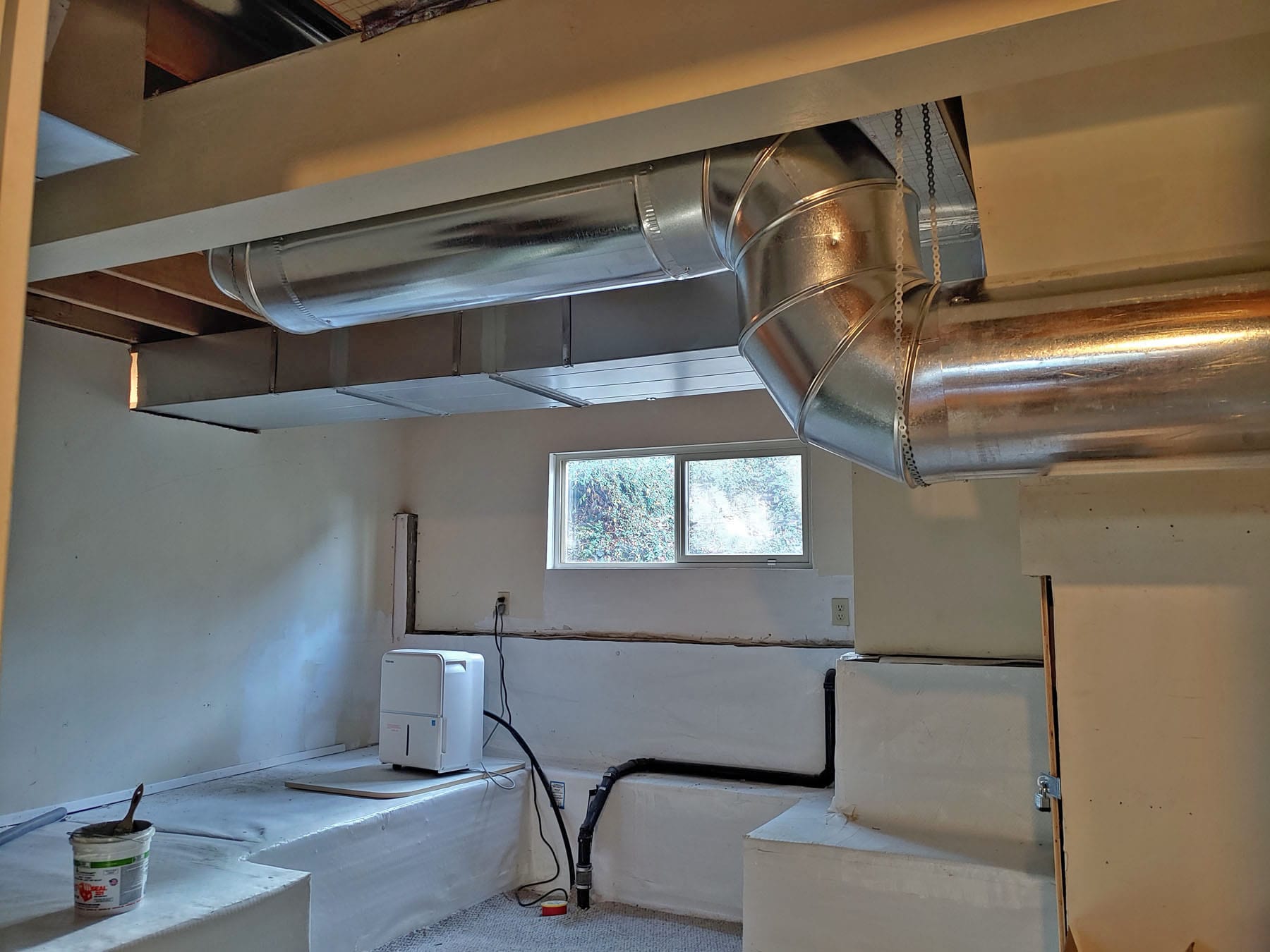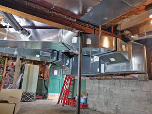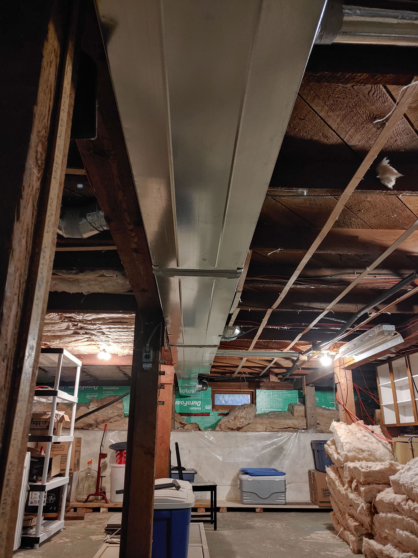 This retrofit project consisted of removing an old inefficient oil furnace and replacing it with a new air handler/heat pump. The new ductwork is far more efficient while being far more compact. Included inside the ductwork are turning vanes, and acoustic insulation to guide the air and effectively reduce turbulent air noise.
