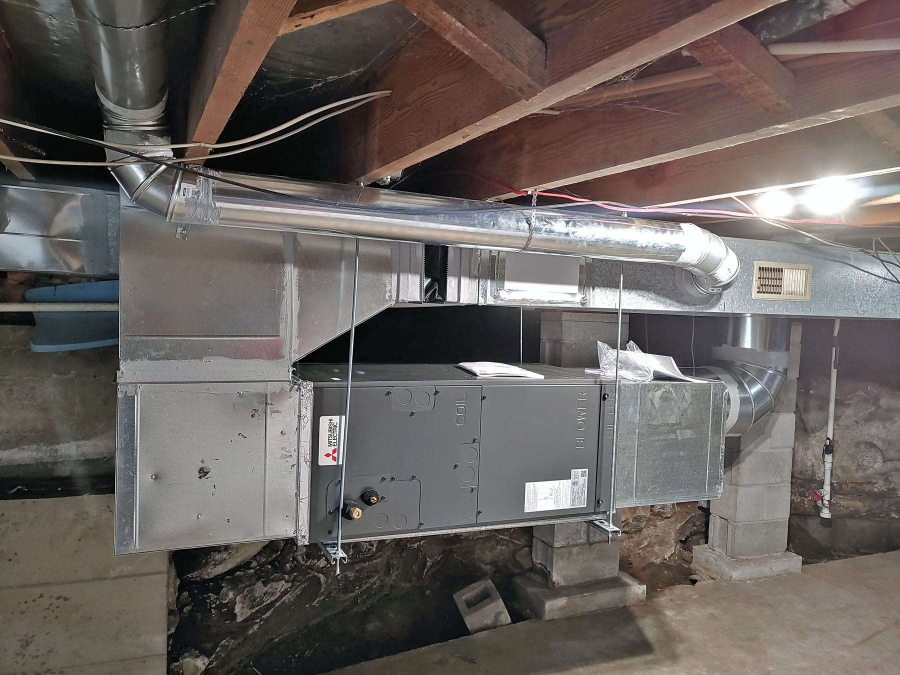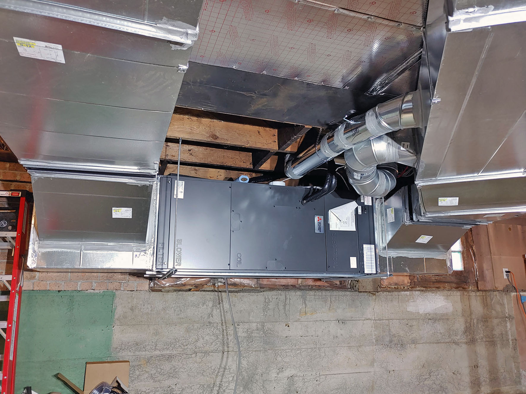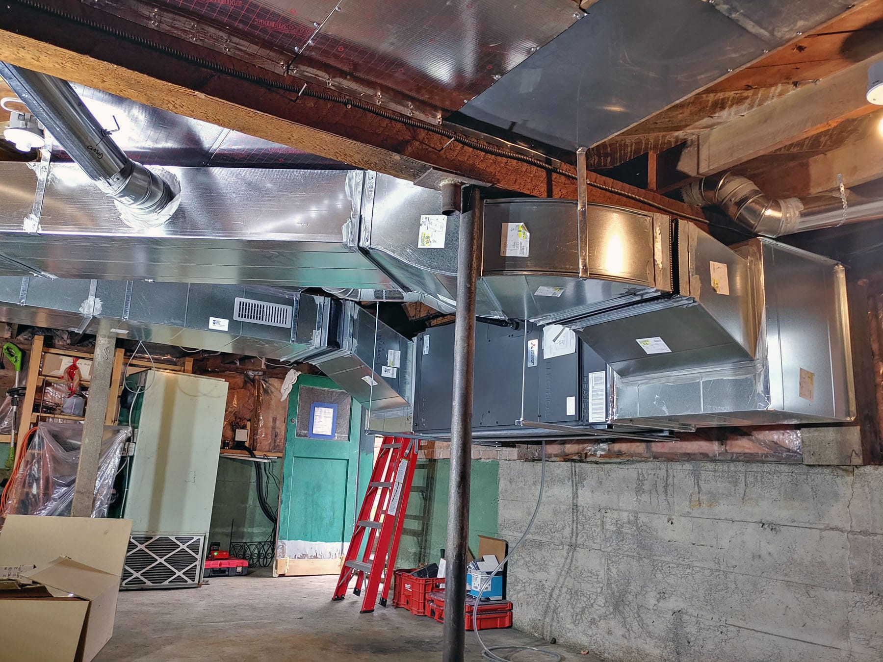 A big change for this 115 year old home, this renovation project consisted of a full duct system and heat pump installation. Our installation includes duct flex connections, acoustic insulation, manual control dampers on a few specific branch lines, and complete sealing of the ductwork to ensure proper efficiency.
