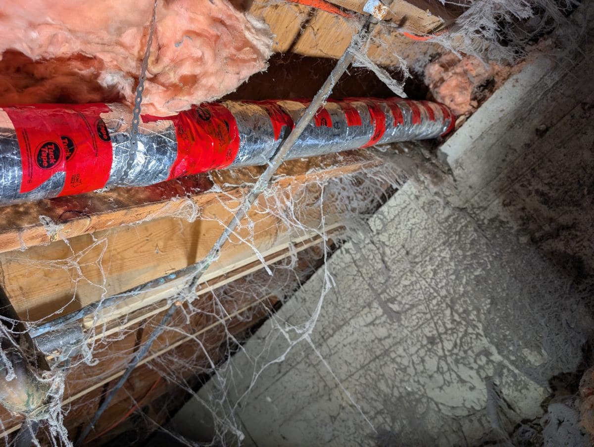 We removed the damaged flex and installed a properly sealed rigid duct system, complete with insulation to minimize condensation. The new system ensures safe termination, efficient airflow, and compliance with current standards.