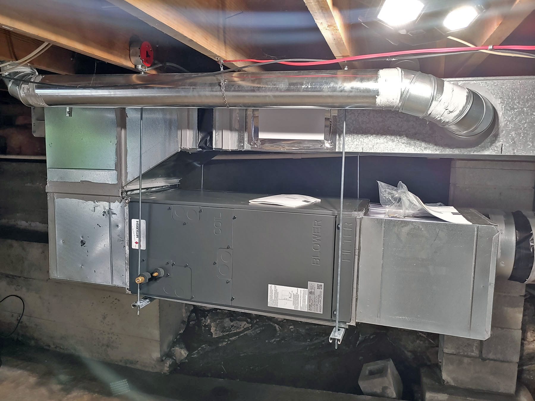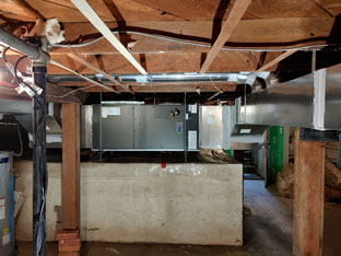 This retrofit required the removal of the old oil furnace and a portion of the existing ductwork and installing a new air handler/heat pump and more appropriately sized ductwork. The duct system and air handler are now correctly sized for this home, with the new cooling factor that has been introduced this system works wonderfully and is quiet, efficient, and effective.